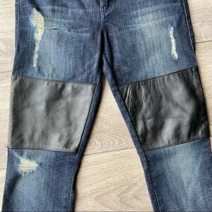 Distressed dark wash denim with zipper detail at pocket and ankles. Skinny fit, medium rise, stretchy! Faux leather patches on the front of the thighs.