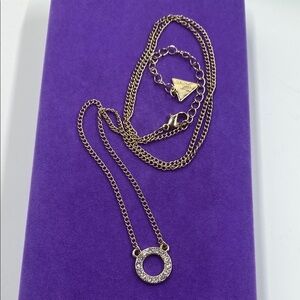 This stunning Guess necklace showcases a gold-toned chain adorned with a circular pendant embellished with sparkling crystals. Its minimalist design exudes elegance, making it a perfect accessory for any occasion.