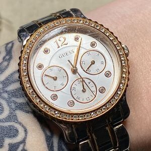 A very pretty and classy watch, beautifully adorned with crystals and gold plated accents. Needs a new battery and has some slight wear on the watch face but style very useful and stylish!