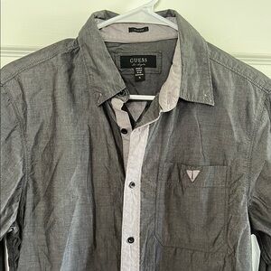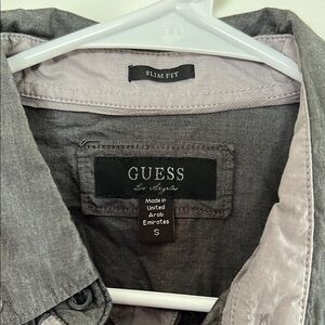 This Guess shirt in a sleek gray hue offers a relaxed fit and a classic button-down style, perfect for casual outings. Crafted from a comfortable fabric, it seamlessly blends style with ease for everyday wear. Excellent condition, size Small, Slim Fit.