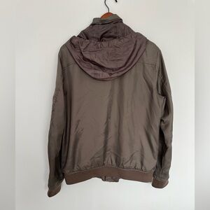 Guess windbreaker in a brown color offers a sporty and casual design, perfect for everyday wear. Featuring a full-zip front and a non-detachable hood, it combines functionality with style. The ribbed cuffs and waistband ensure a comfortable fit, making it an ideal choice for breezy days. Size XL small flaws showed in picturess