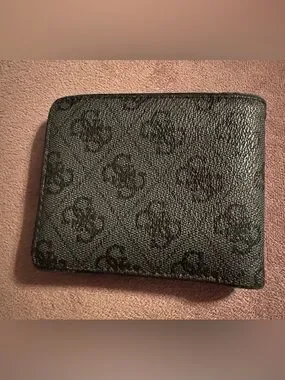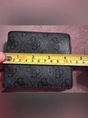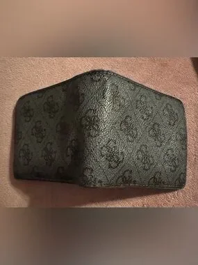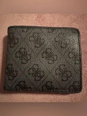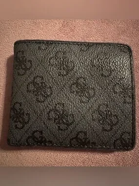 Sleek grey wallet with an all-over textured monogram pattern in black from Guess. Stitched edging for durability. Classic and versatile accessory. Subtle repeating emblem design.
