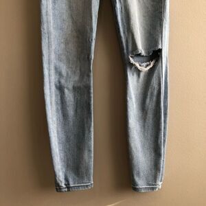 Guess soft and stretchy high rise waist distressed skinny leg fit denim jeggings jeans pants. Blue in colour. Size 26. Approximate measurements | waist: 26“ length: 37“ inseam: 26.5“ rise: 10.5“ Good pre loved condition / GUC - elastic pull marks near groin (pictured). Fabric and care tag are pictured. Offers welcome!