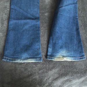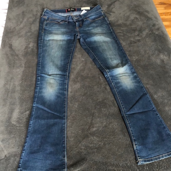 Size 26 low rise skinny boot Guess jeans in previously loved condition. There is wear at the bottom of the jeans, a small hole forming in the crotch area and some pilling. Other than those minor defects, they are in excellent condition!