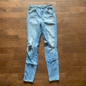 - Light blue, intentionally distressed skinny jeans