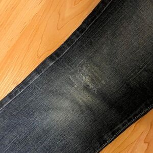 There is some wear at the bottom near the ankles. There has been a patch sewn in as seen in photo but not overly detectable.