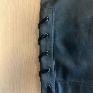 Guess jeans vegan leather velvet lace up pants size 4 (26) I bought these almost a decade from the “Guess” store at chinook centre in Calgary, thinking all this time they would one day fit… they don’t 😂 super cute and very goth/gorpcore these are a SMALL size 4 waste is 26 and not much stretch. Soooo nice though!