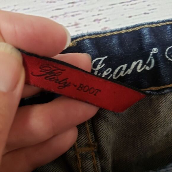 Guess Jeans, Flirty Boot Cut. Dark Wash. Good used condition, slight wear on inner leg as pictured. Some distressing throughout with unique flap back pockets. Size 30 R, measurements in the photos