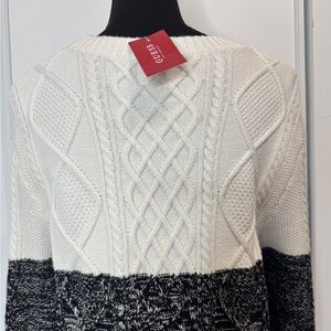 🆕 Cozy meets style in this Guess knit colorblock sweater, featuring a classic cable knit design in chic beige and black tones.