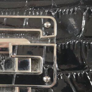 Straps are chain link, & a silver tone finish. Can be carried on shoulder or by hand. Has a strip of faux leather in middle of the chain.