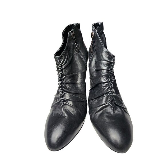Style: Stunning and gorgeous!! Gathered leather upper with a sleek 5" stiletto heel. Inside zippers. Ankle height. Almond rounded/pointed toe. Dress up or down. Sexy and beautiful!!