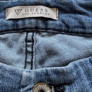 Classic Guess jeans in light blue denim. Features a button closure and signature branding. Size 27 US