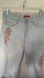 Guess jeans, in very good condition. Embroidered floral details in front of legs, raw hem and busted knees, light wash with bleach spotted distressing throughout, light stretch cotton blend fabric. Marked size 28.