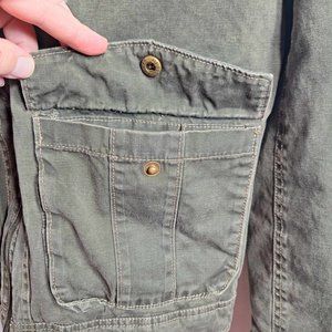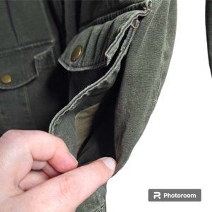 2 pockets lower front with flaps and snap closure, 2 open pockets behind the snap closure pockets.