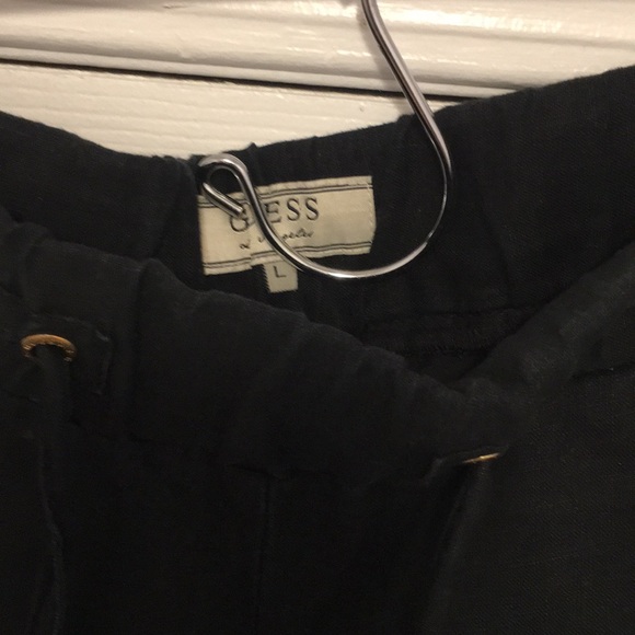 These black linen Guess trousers measure 19 stretched across the waist. They have elastic and a draw string. The hips measure 24 across. The inseam is 31. The bottom on the trousers measure 13 inches across. They are a large and fit like an 8. Working pockets in the front and back. Great for the night on the boat. I loved these pants. Always dry cleaned. ❤️