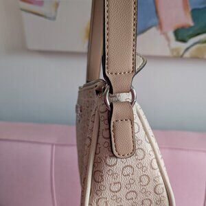 This is in a new condition Guess handbag. It features a logo print all over the outside of the bag. It has an exterior zipper closure as well as an internal zipper pocket and another open pouch inside. The exterior zipper can be stiff to open/close when it gets right to the very end but it's still functional and works fine as long as it doesn't get pulled right to the extreme end.