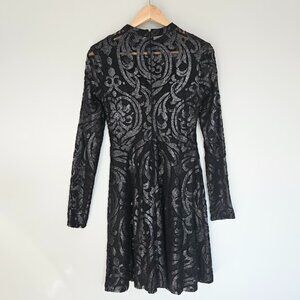 Guess Long Sleeve dress with black mesh overlay and shimmery pattern. The outer layer is semi-sheer with a soft metallic sheen, while the inner camisole lining provides full coverage. Long sleeved, high neckline, fit-and-flare silhouette.