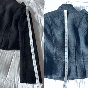 Double breasted black jacket with gold buttons and hook and eye fastening. Fully lined
