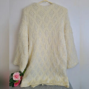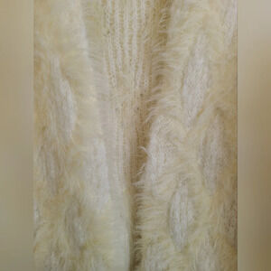 Wrap yourself in cozy elegance with this Guess ivory cardigan sweater. Featuring an open front and a chic shawl collar, this chunky-knit piece is perfect for those crisp fall days. The long sleeves and fuzzy, textured finish add a touch of warmth and style, while the intricate knit pattern brings a unique flair to your casual wardrobe. Made from a blend of polyamide and acrylic, this vintage-inspired sweater is both soft and durable. Pre-owned and in excellent condition.