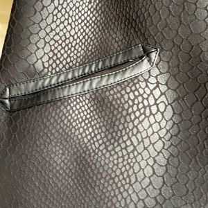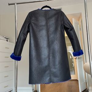 Guess Los Angeles reversible faux fur coat vegan leather size XS, could fit a small. Beautiful coat in great condition worn a handful of times! This cost is reversible, one side is blue faux fur and the other side is vegan leather crocodile texture. The zippers work great and it has pockets on both sides! I’m 5’2 and this coat hits my knees.