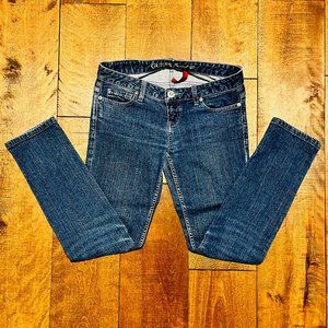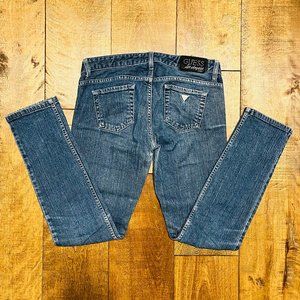 Guess low-rise foxy skinny jeans with a medium wash and a flattering fit, size 26. It has the classic five pocket construction with silver tone hardware.