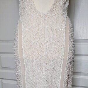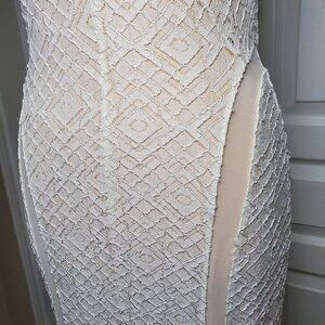 Guess sleeveless knit lace fit-and-flare maxi dress gown with mesh side panels and open back in cream color size small.