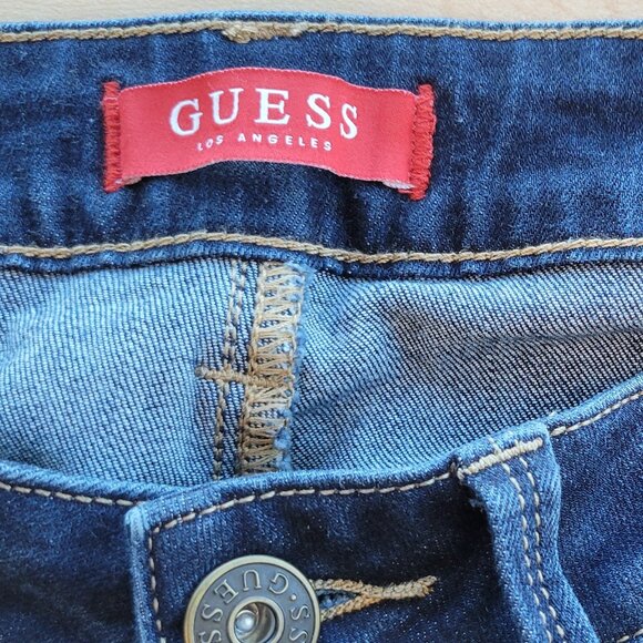 Looking for something that compliments your figure, then try out this Guess skinny jeans. The silouhette of the jeans is a medium rise cut to help compliment the curves of a woman's hips. Features a stretchable material for ease of movement, and five pockets for small items. As well as distressed patches along the jeans for a touch of a roughish appeal.