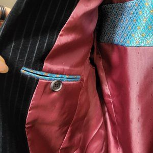 Found, going through items in the closet, this velvet like, plush men's blazer. It's in great shape, gently used. No obvious rips or damage, but has loose threads on one sleeve. Is a little dusty, but otherwise very clean. Blazer is a Men's small in size.