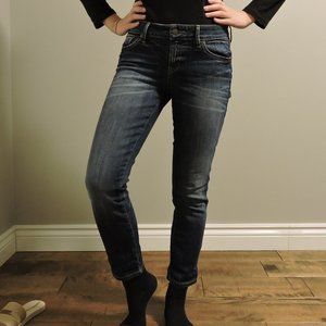 Guess mid-rise jeans cropped at the ankle with a medium wash and intentional fading. It has the classic five pocket construction, size 26.