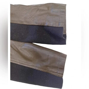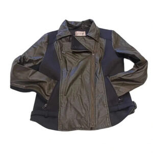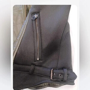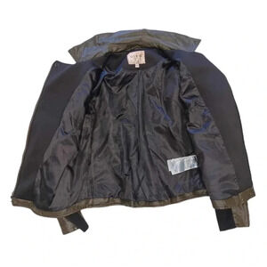 Dark green pleather and black panels make up this jacket. It's got long sleeves and a spread collar. The jacket zips closed and has three zippered pockets on the outside. This coat would compliment a winter wardrobe.