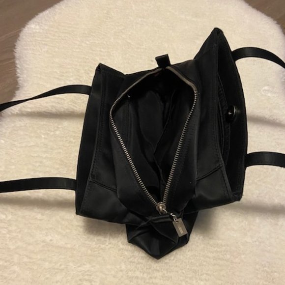 Guess nylon purse in really good condition. No rips or tears. Has 3 compartments. 2 are zippered with a Guess logo and the other compartment is buttoned. 10" Width and 7" height. Straps hang 11" down. Very cute and compact purse.