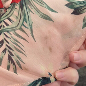 Sheer and lightweight material, Red hibiscus 🌺 flowers, tropical greenery, pink overall colour.