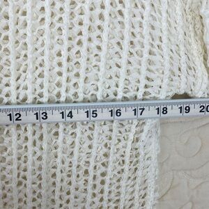 Guess open knit sweater. Women’s tag size XS Extra Small (see actual measurements in photos). Fabric tag cut out. Body is slightly off-white. Ripped collar, hem and cuffs are white. Loose, open knit of ribbon like yarn means lots of stretch. Perfect for layering.