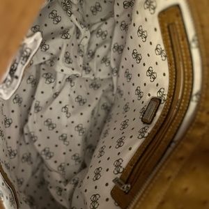 NEW, never used, Guess caramel ostrich purse. This purse is big and roomy enough to carry everything you need ! Can be carried using handles or over the shoulder. Great for use as a travel bag !