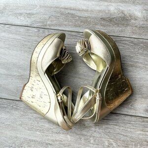 Guess Pewter Metallic Wedge Ankle Strap Peep Toe Heels Shoes Buckle