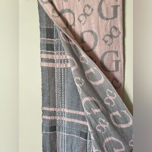 Elegant Guess scarf with a pink and gray pattern. Adds a stylish flair to any ensemble.