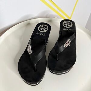 Guess platform black thong sandal with little dangling charm on the strap. Silver hardware and accents - minor signs of wear
