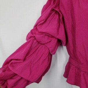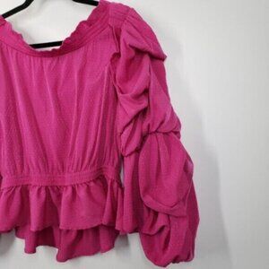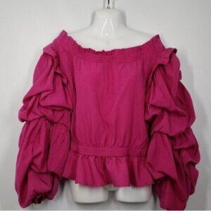 Pink Fuchsia off the shoulder blouse top. Unique ruffled long sleeves. Peplum elastic waist and ruched detail at neckline.