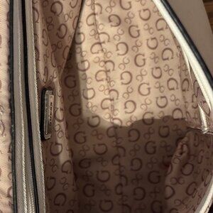 white with navy accents, a sleek vertical stripe, and the cutest flower charm with pearl details