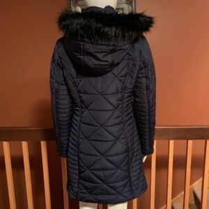 Weather-ready hooded puffer jacket with removable faux fur trim and logo detail.