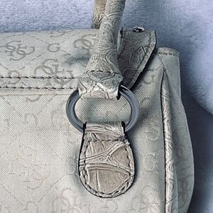Elevate your accessory game with the classic charm of this vintage Guess handbag. With its iconic beige monogram canvas and a hint of metallic finish, this top handle bag marries 90s nostalgia with contemporary style. The small size, measuring 5 inches in height and 8.5 inches in width, makes it a perfect companion for your essentials without the bulk.