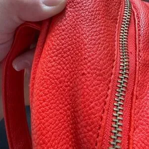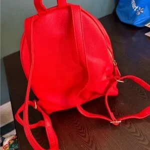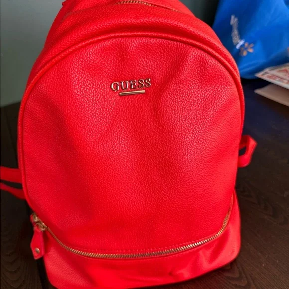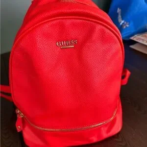 Vibrant red Guess backpack with gold accents. Stylish and functional.