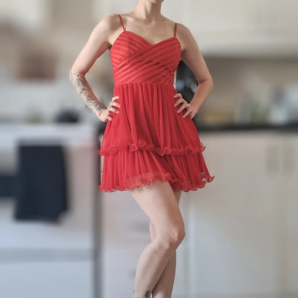 This vibrant red mini dress by Guess features a ruched bodice and tiered ruffled skirt, perfect for a cocktail night out. The sleeveless design with spaghetti straps and a sweetheart neckline adds a touch of elegance to its playful silhouette. Quality padded chest. Size small. Dress 4-6