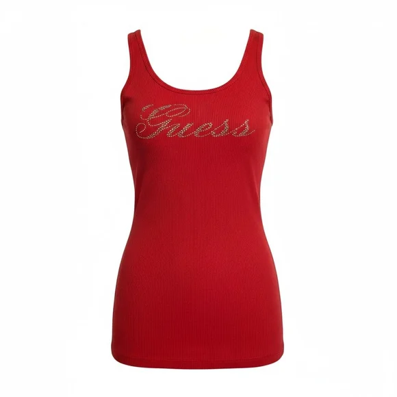 Stylish red tank top featuring a sparkling rhinestone Guess logo. Ideal for casual outings.