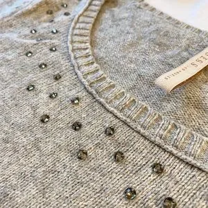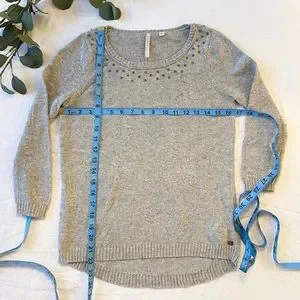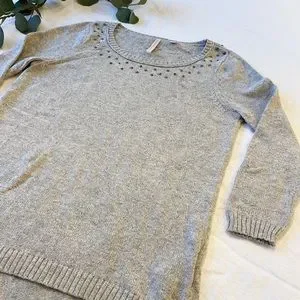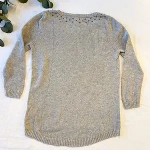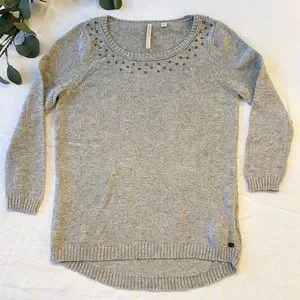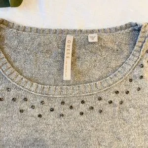 Guess grey sweater with rhinestone collar detail. Cozy and soft mixed fibre sweet with angora. 3/4 length sleeves.