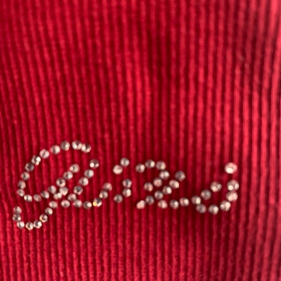 Red in colour., size small, ribbed, close fit, good condition. Button down style with gemlike buttons & Guess logo on lower left corner. Contains 2% Elastane