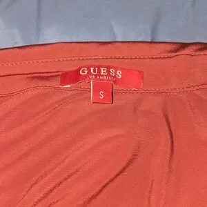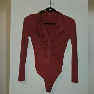 Satin-look button-front blouse with ruched center. Long fitted sleeves and classic collar. Smooth, slightly glossy finish for an elevated style.
