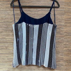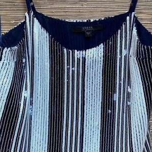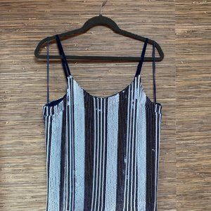 Very cool white and navy blue sequined boxy tank top by Guess. Size Large. Lined. Item is used and there may be pulled threads and missing sequins that I haven't noticed. Looks great under a jean jacket!