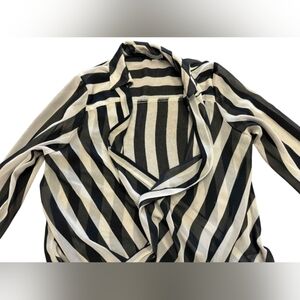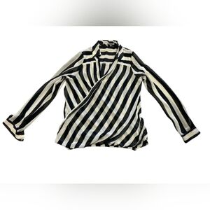 Sheer long sleeve top striped creme and black high low twist front button cuffs spread collar wrap style front 1 button closure minimal stretch available
