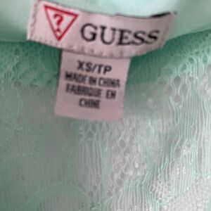 Sheer mint coloured Guess shirt, gold buttons, two small pockets, sleeves can be worn full length or 3/4 length button option. Lace detailing on upper front and upper back.